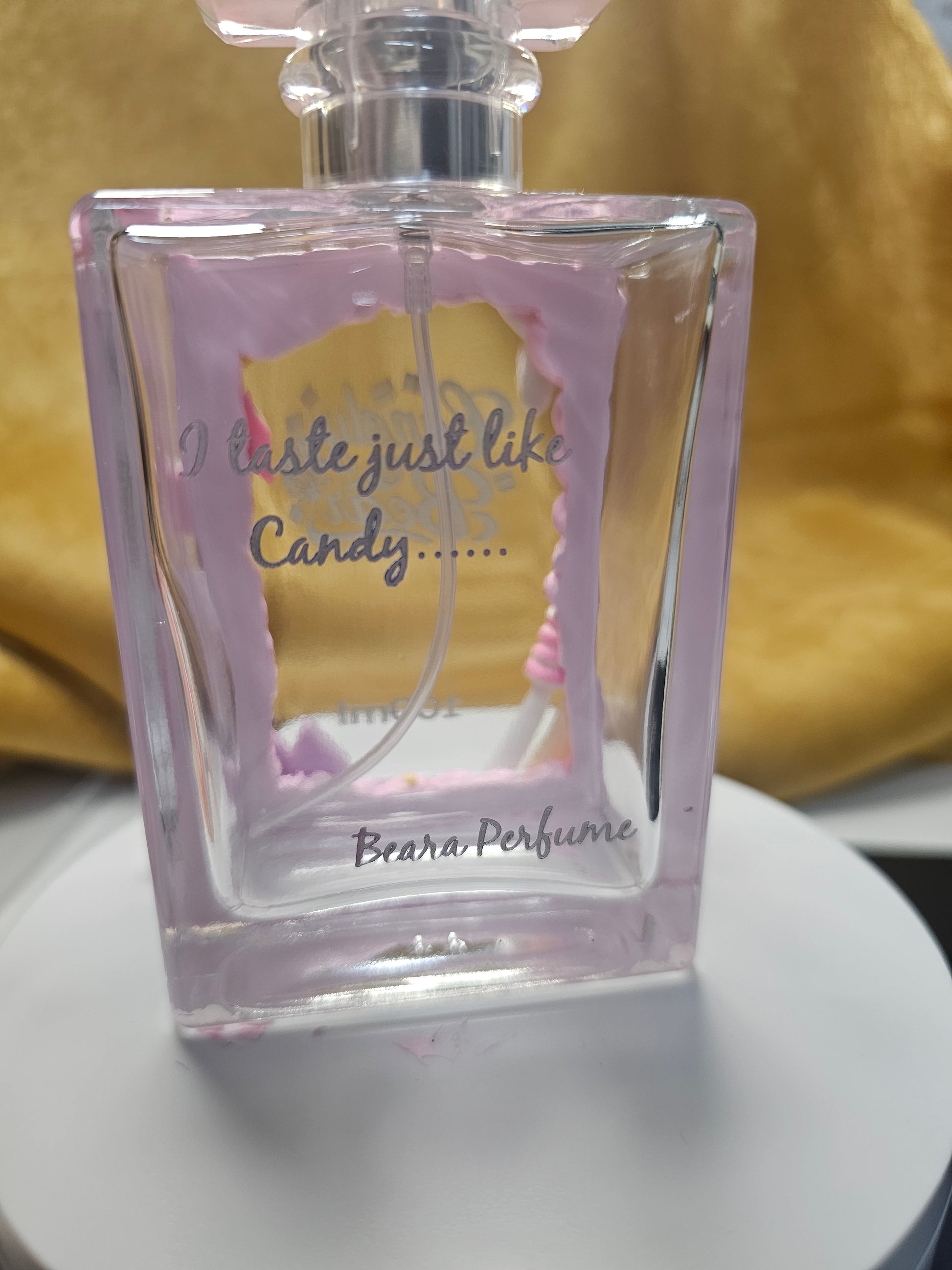 SWEET Candy perfume with a refillable atomizer. FOREVER KEEPSAKE. 4oz Junk glass perfume atomizer. Great for the holidays! Engraving can be customized. Please leave a note or send an email with your order number. Names, and/or up to 5 words same price. For any other customized engraving, please reach out via email or DM @bearabyme for quote.
