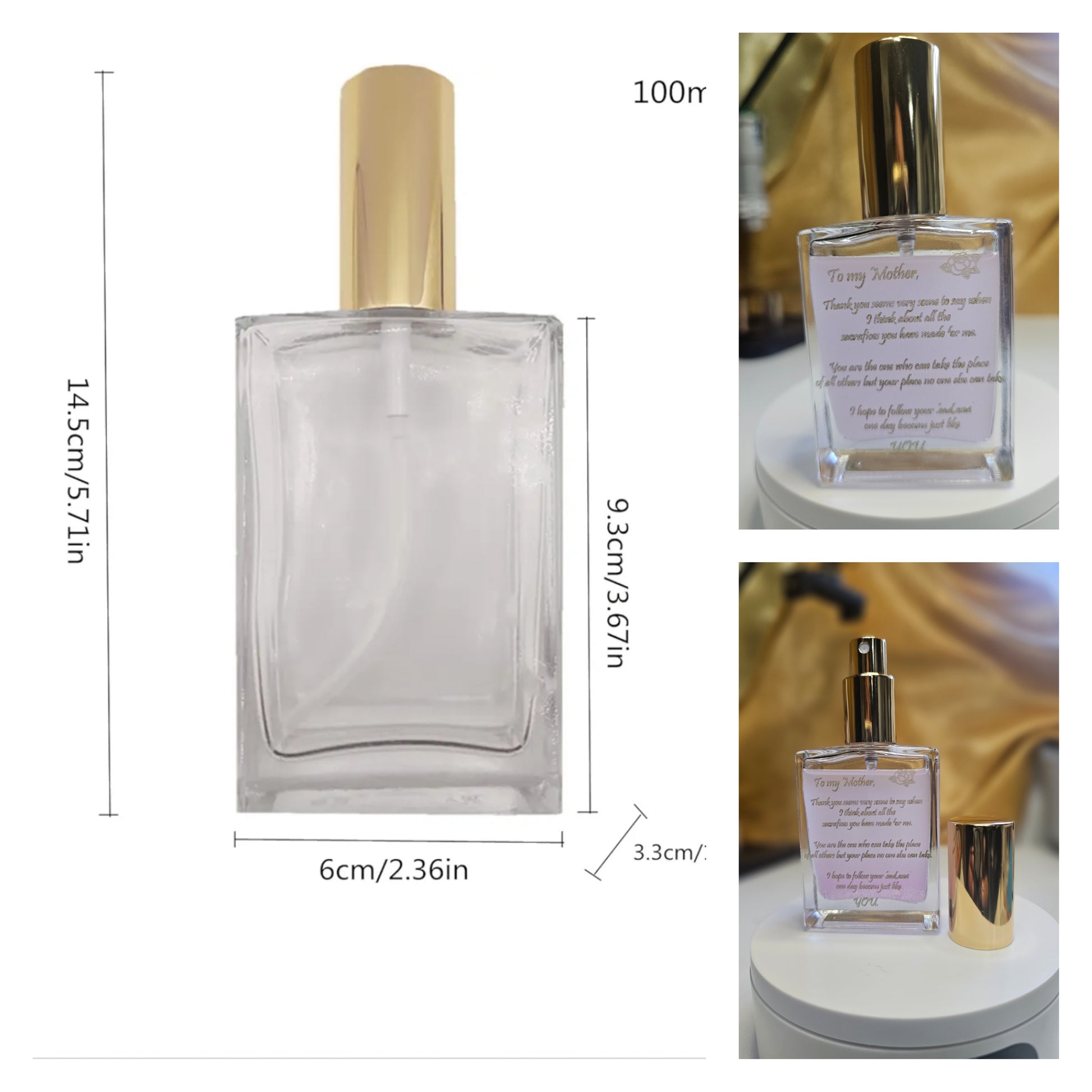 Great gift for mom, engraved/gold glass bottle, with gold sprayer. Please see all picturs for bottle volume and sizing. Beara Fragrance included.